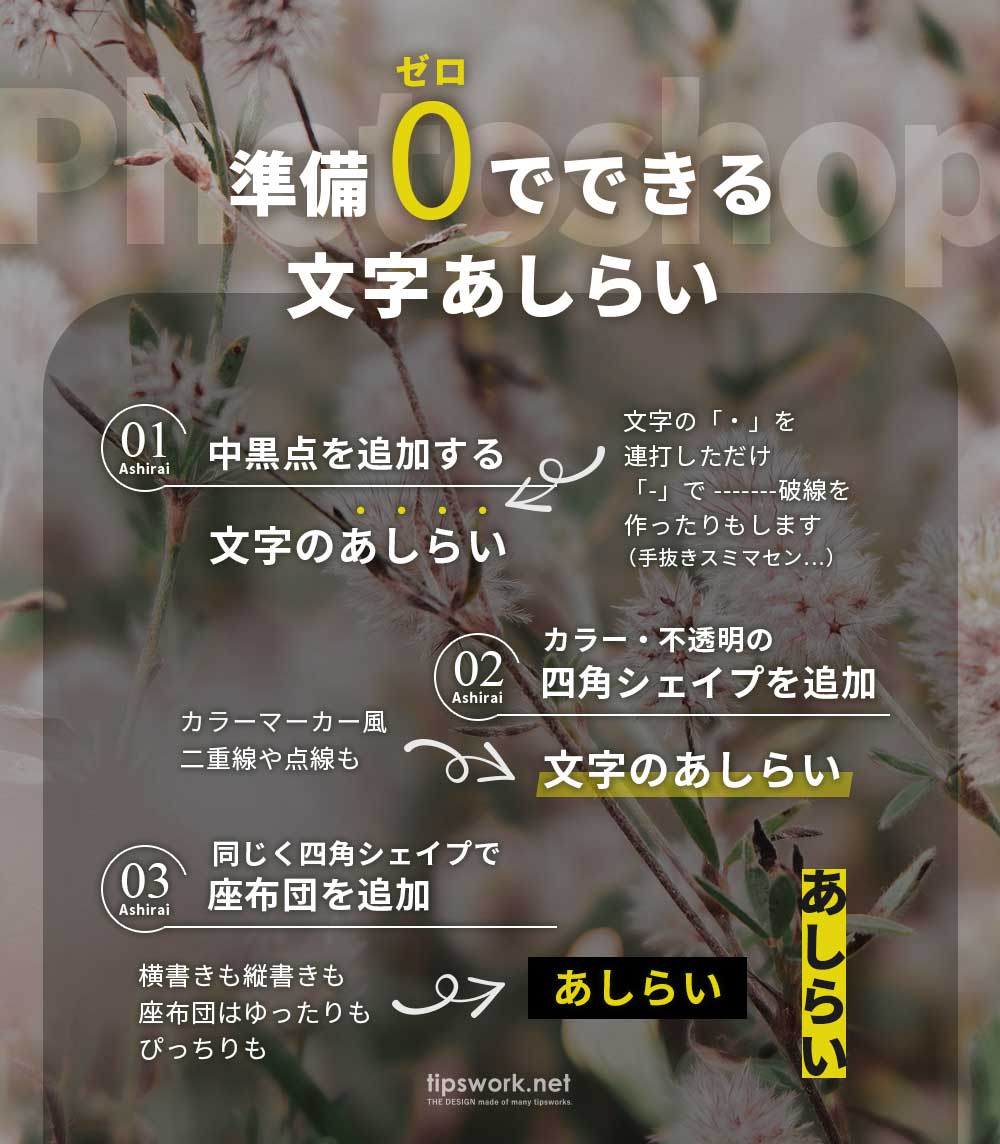 四角シェイプを背面に敷いて囲むことを「座布団と敷く」とか「座布団もじ」とか言ったりします。ゆったり敷くのも良し、ぴっちり目に敷くのも良し。 - 文字に変化を付ける