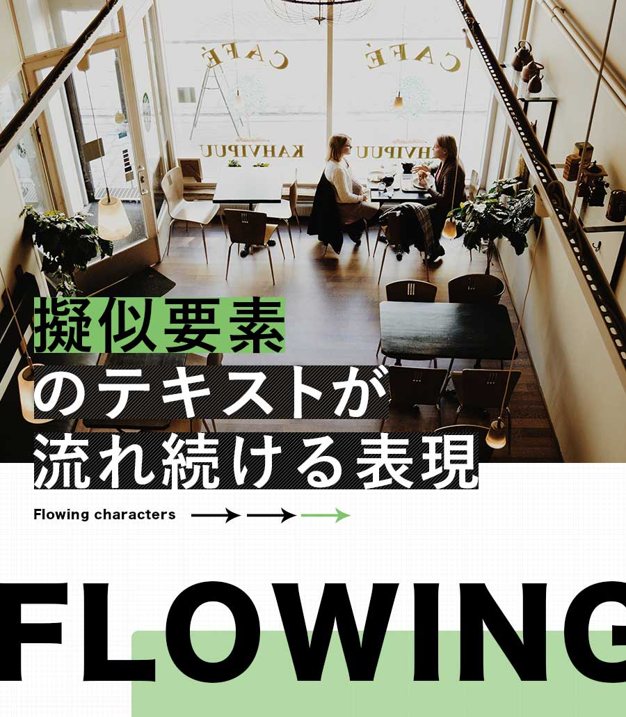 大きいテキストが画面幅いっぱいに流れる表現、画像を用意しなくても擬似要素テキストで実装できます。