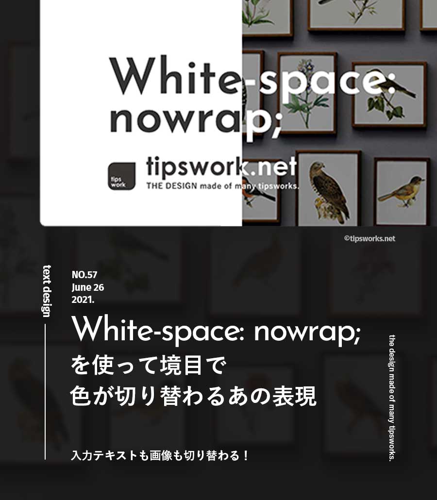 ホワイトスペースを無視して自動改行されないプロパティ。overflow:hidden;との合わせ技で、境目からテキスト色が切り替わるあの表現に。 abusoluteだけ使っても実装できますが、横に切り替えならこっちが簡単な気がします。