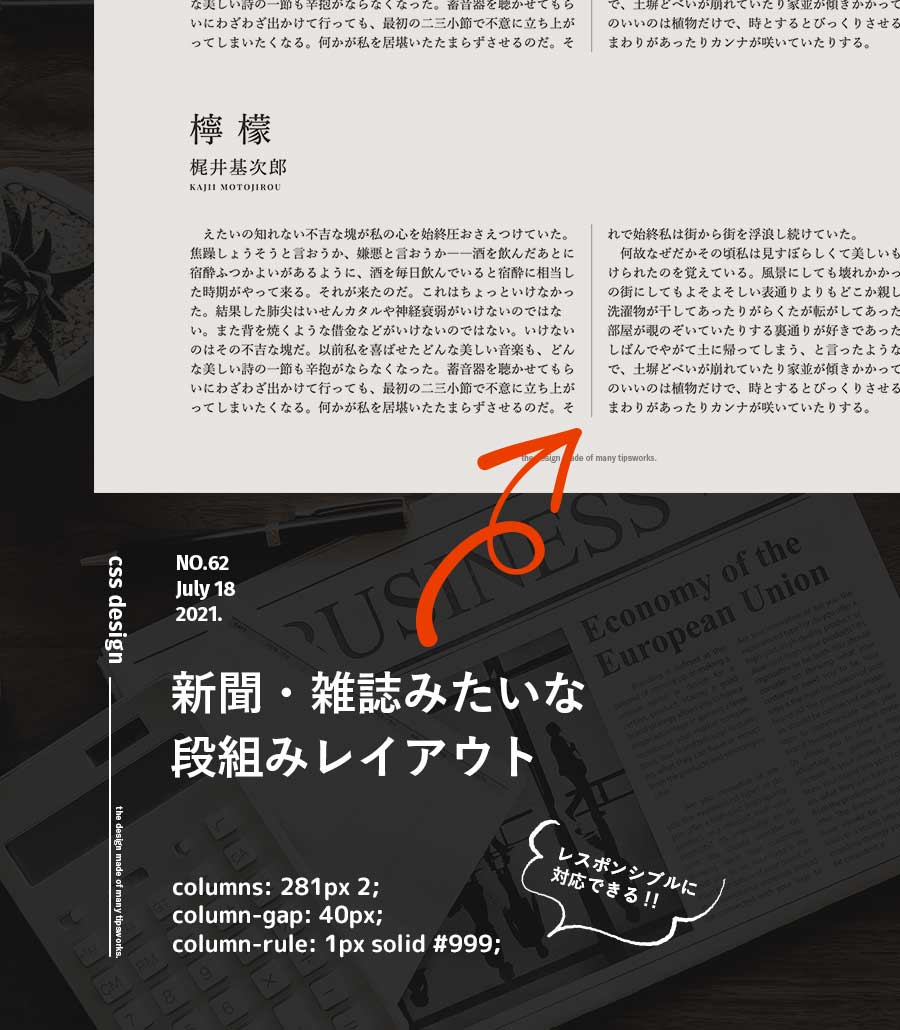 長すぎる行を分けて読み易くする段組みレイアウト、雑誌や新聞などの紙媒体でよく見かけますよね。 実はCSSでも簡単に実装できます。 個人的にはスマホでは不要だと思いますが、PCのみのデザインとしても使う場面ありそうです。